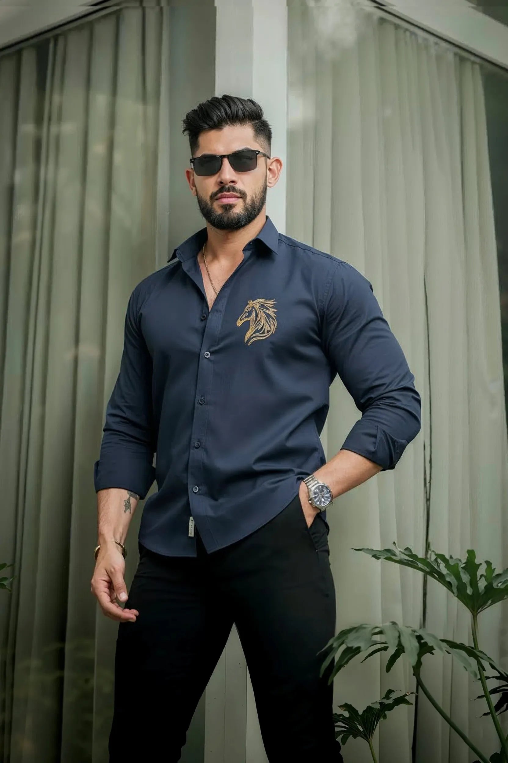 Unveil a new dimension of modern elegance with the Blue Golden Horse Diamond Pattern Shirt with Embellished Side Work.