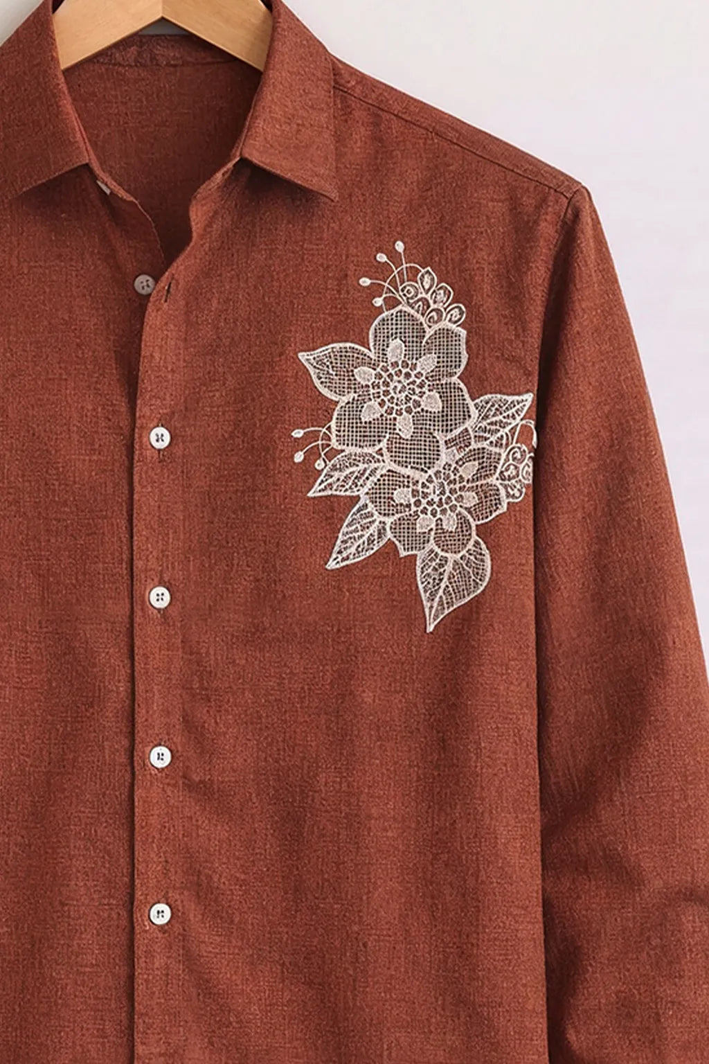 Elevate your wardrobe with this premium rust brown embroidered shirt for men, crafted for those who appreciate subtle luxury and refined detailing. Featuring elegant white floral embroidery placed thoughtfully on the chest and lower panel, this shirt delivers a sophisticated statement without being loud.