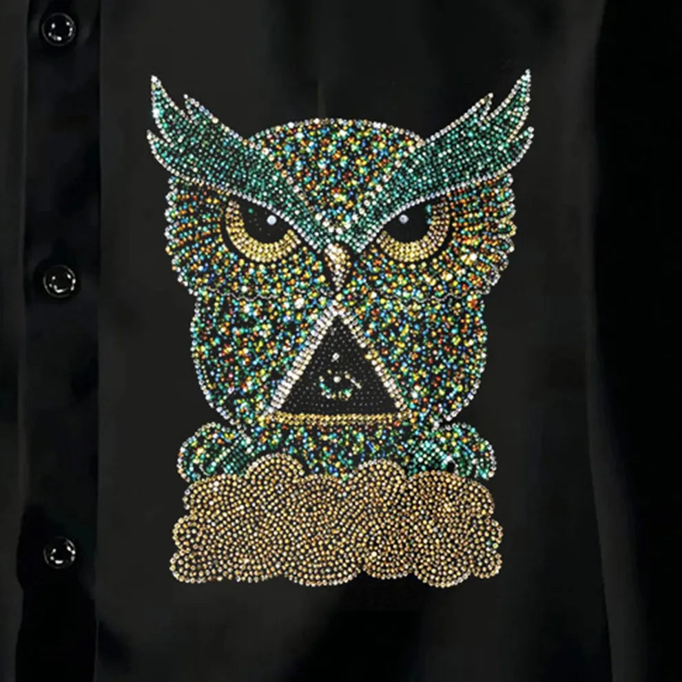 Command attention with the Rajsab Midnight Owl Diamond Work Shirt, a symbol of wisdom, power, and mystery. Designed on a deep black base, this shirt features an intricately Diamond Work owl motif placed on the chest, highlighted with rich emerald green and antique gold detailing.